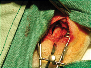 Figure 1: Maxillary sinus of a rabbit exposed bilaterally to receive bone graft or bioimplant.