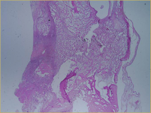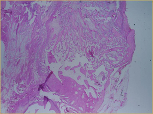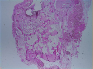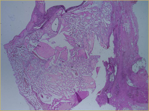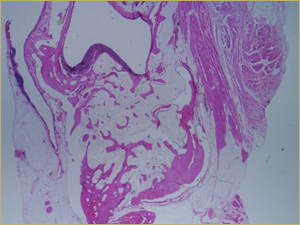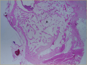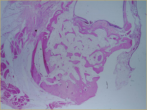 Figure 4a: Low-power histologic examination of rabbit maxillary sinus augmented with demineralized bone matrix at 2 weeks after procedure. H&E stain, 50× magnification.