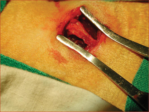 Figure 2: Posterior iliac crest of a rabbit exposed for harvesting of material for autogenous bone grafting.