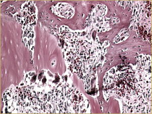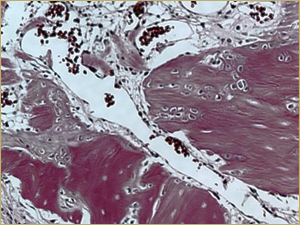 Figure 6b: High-power histologic examination of rabbit maxillary sinus augmented with bone morphogenetic protein in demineralized bone matrix at 2 weeks after procedure. H&E stain, 200× magnification.