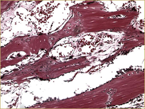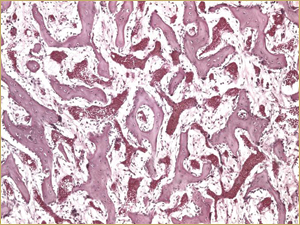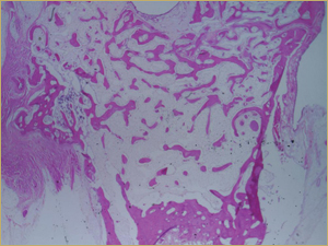 Figure 10: Low-power histologic examination of rabbit maxillary sinus augmented with bone morphogenetic protein in demineralized bone matrix at 8 weeks after procedure. H&E stain, 100× magnification.