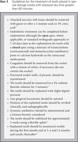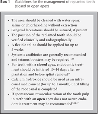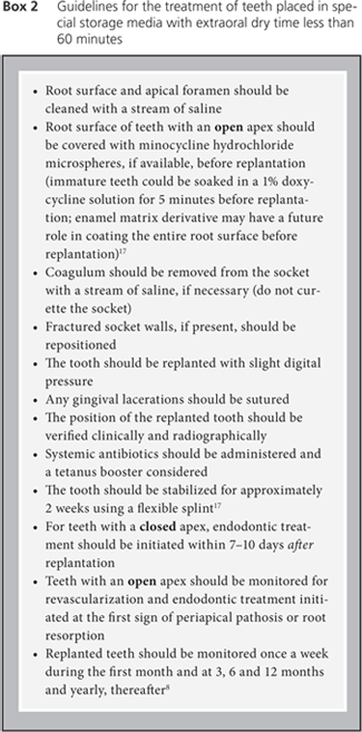 Avulsion is a broad topic and beyond the scope of this article. Excellent reviews have been published elsewhere.9,14,17 However, several factors can influence the approach to avulsed teeth, including whether the tooth has a closed or open (1 mm or more) apex, whether it has been replanted, whether it has been kept in special storage media and whether the extraoral dry time is less than or longer than 60 minutes, as the critical limit for dry time is reported to be no more than 20 minutes.17 Guidelines for the management of avulsed teeth are presented in Boxes 1–3.