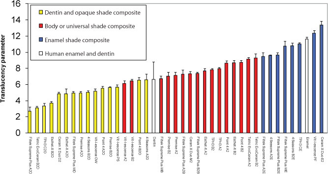 Results: A continuum of values for the translucency parameter was obtained, ranging from the most opaque (Filtek Supreme Plus A2D) to the most translucent (Ceram X Duo E2). In general, “opaque” and “dentin” composites yielded relatively low translucency values, “body” (or “universal”) composites yielded intermediate values, and “enamel” composites yielded relatively high values. However, the boundaries between these categories were not distinct, and there was some overlap. The mean value of the translucency parameter for human enamel was within the range of values for “enamel” shade composites. The individual values for specimens of human dentin were more variable (i.e., greater standard deviation around the mean) than those for human enamel. The mean value obtained for dentin was intermediate between the ranges for composites with low and intermediate translucency.