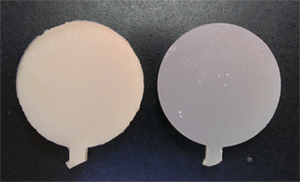 Figure 2: Composite specimens of the same shade on a standard black background, one with a low translucency parameter value (more opaque; on the left) and one with a high translucency parameter value (more translucent; on the right).