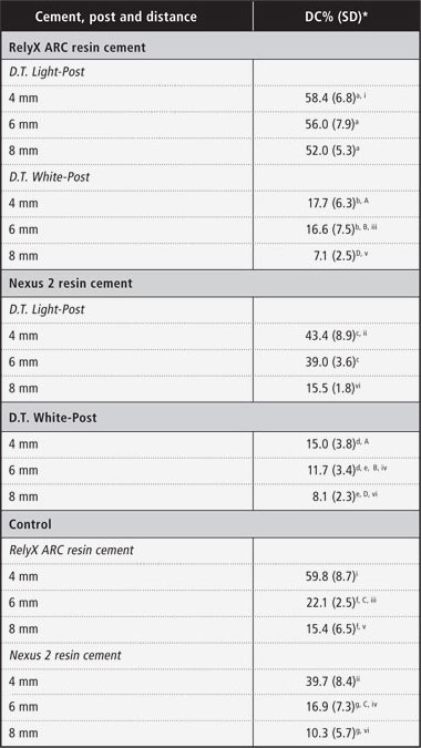 Because of the dramatic drop in light intensity with increasing distance, dual-cure resin cements have been introduced to compensate for the lack of adequate light intensity in deep areas through chemical initiation of the polymerization reaction.16 It seems that using a dual-cure cement in combination with translucent posts may overcome the problem of inadequate polymerization conversion, but the results show that the type of cement is also a factor in determining DC% (Table 2).