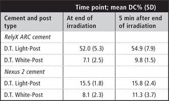 For tests involving the D.T. Light-Posts, higher DC% was observed with RelyX ARC cement than with Nexus 2 cement (p < 0.05), probably because of differences in their chemical compositions. Factors such as chemical formulation, type and amount of resin, initiator system and size of filler particles have all been shown to influence the curing process.18-20