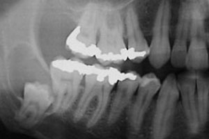 After 7 months of orthodontic extrusion followed by a 3-month retention phase to ensure adequate bone maturation,11 a significant reduction in the cystic cavity had occurred as well as new bone apposition on the distal surface of the second molar. At a 2-year follow-up appointment, clinical and radiographic examination confirmed that only a minimal bone defect remained on the distal surface of the second molar (Fig. 6). Thus, combining marsupialization with orthodontic extraction enhanced bone apposition, decreasing the risk of periodontal breakdown at the distal surface of the second molar and increasing the resistance of the mandible. The latter was of utmost importance as the patient was a windsurfing instructor and, thus, prone to pathologic fracture.