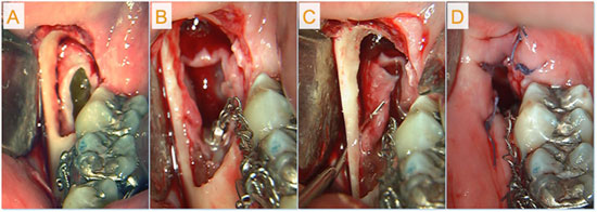 Figure 3: Surgery included: a) exposure of the cyst lumen; b) exposure of the crown of the third molar and bonding of an orthodontic buttonhole to it; c) creation of cortical perforations for marsupialization; d) partial wound closure.