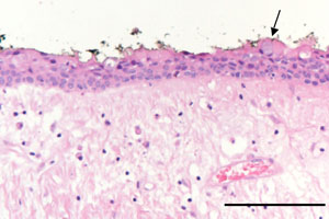Figure 4: Photomicrography showed a thin non-keratinized epithelial lining composed of 2–3 layers of cuboidal epithelial cells and a fibrous connective-tissue wall loosely arranged. The arrow indicates an occasional mucous cell (bar = 0.2 mm).