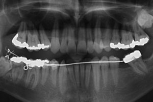 Before surgery, an orthodontic appliance was installed to create a stable anchorage and prevent undesirable movements of other teeth resulting from the application of extrusive force to the impacted molar. A lingual arch was cemented to the mandibular first molars, and a passive sectional stainless steel wire was bonded directly to the buccal surface of the mandibular right molars and premolars using a light-cured composite resin.
