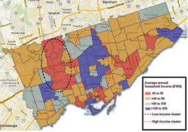 The map of average annual household income (Fig. 1) reveals 2 distinct clusters. Of the 21 communities with incomes above $100,000, most (81%) are located in central Toronto. This high-income cluster is surrounded by middle- and upper-middle-income areas that form the majority (57%) of the 96 Toronto FSAs. To the west of the high-income cluster is a distinct low-income cluster (> $40,000–$60,000) which includes 50% of the 20 low-income FSAs in Toronto.