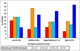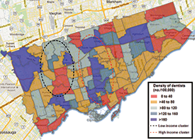 Results: Communities with high household incomes and high dentist density were clustered in central Toronto. Income-based disparities in dentist distribution were also observed. Compared with low-income FSAs, dentist density increased by a factor of 2.47 in the highest income FSAs. Dentist density also increased with income and education but decreased with immigrant level.