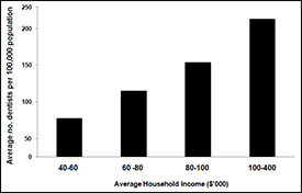 The results indicate an uneven distribution of dentists across metropolitan Toronto based on average annual household income, education and immigrant status. Moving from the lowest- to highest-income cluster, an observable increase in the number of regions with high dentist-to-population ratios (i.e., FSAs with ≥ 120 dentists per 100,000 or less than approximately 833 individuals per dentist) is seen. This disparity is reinforced by our finding that there are 2.47 times as many dentists per 100,000 population in the highest income areas than the lowest. This confirms our hypothesis that areas with higher affordability are associated with a higher availability of dentists.