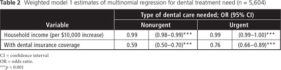 Table 2, based on the multinomial regression model 1, shows the unadjusted effects of dental insurance coverage and income on need for dental care. The odds ratio for insurance coverage was 0.59 for those needing nonurgent care and 0.76 for those needing urgent care. Therefore, relative to those with no need for treatment, the odds of needing nonurgent care were 41% lower for individuals with dental insurance coverage than for those without coverage. Similarly, the odds of needing urgent care were 24% lower for individuals with dental insurance than for those without coverage. The odds ratio for household income was 0.99 both for those needing urgent care and for those needing nonurgent care, which represents a 1% decrease in the odds of needing urgent or nonurgent dental care with each $10,000 increase in household income. The results for both insurance coverage and income were significant at the 0.001 level.