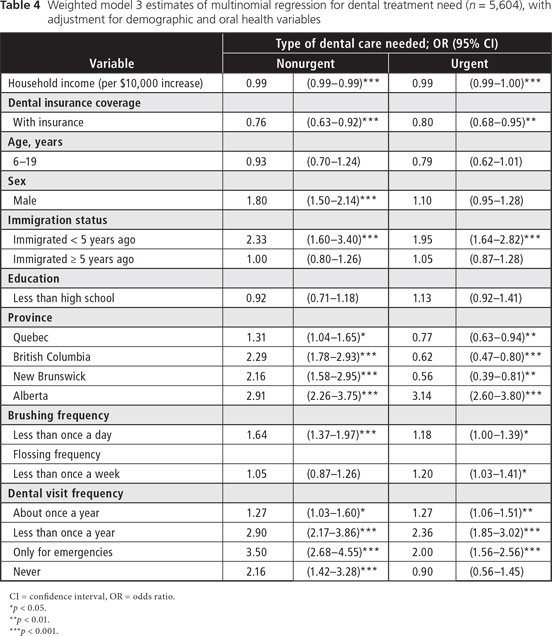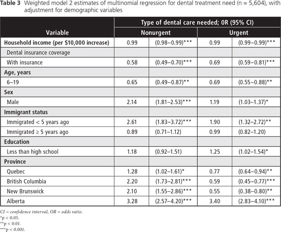 Methods: Multinomial logistic models were fit to data from the 2009 Canadian Health Measures Survey to test unadjusted associations among household income, dental insurance coverage and the need for urgent and nonurgent dental care. Adjusted associations, controlling for socio-demographic variables (age, sex, immigration status, education and province of residence) and oral health habits (brushing, flossing and visits to the dentist) were also evaluated.