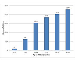 During the 36 months of the program (1 April 2010 to 31 March 2013), 8396 tracking forms were submitted by over 141 dentists (12 pediatric and 129 general dentists); not all dentists provided their name and, thus, were not individually identifiable. The mean age of the children was 24.2 ± 7.8 months (range 0.25–36.0 months) with an almost even distribution of boys (51.8%) and girls (48.2%).