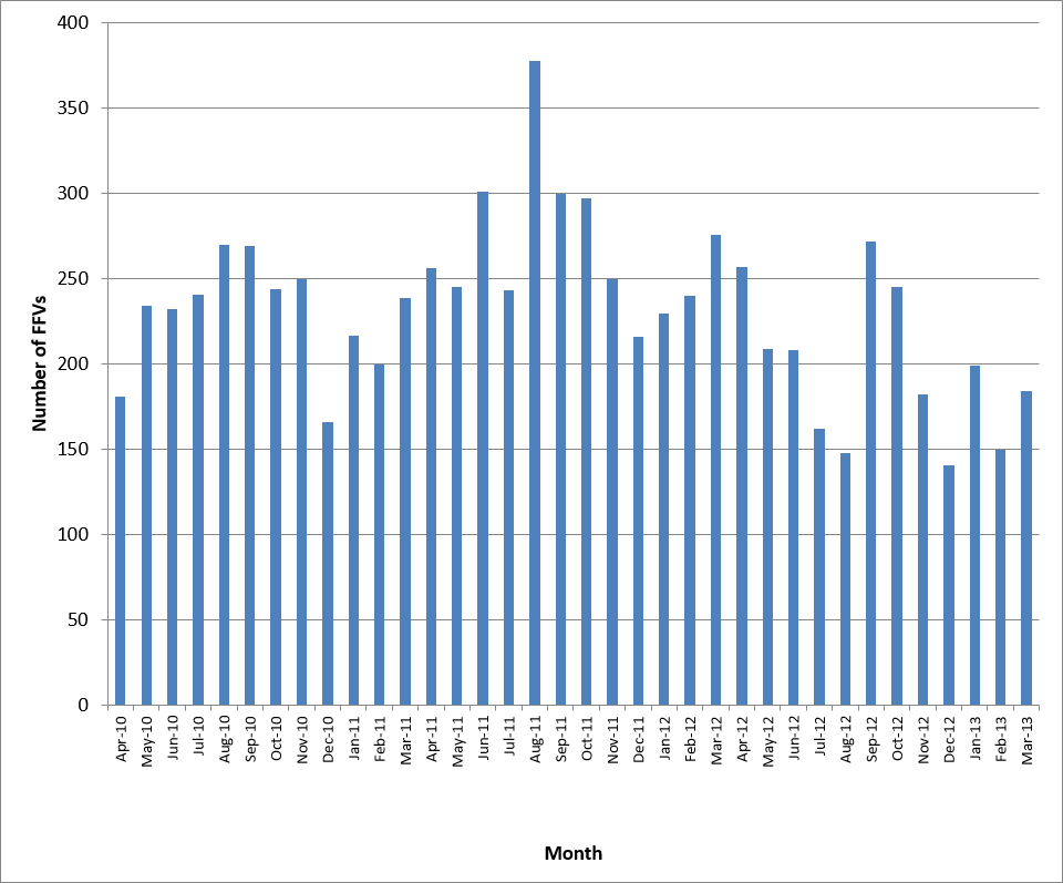 Analysis of FFV tracking form data over 36 months revealed that nearly 9000 infants and toddlers had participated in this program. Considering that some dentists may be providing this service, but are not completing the MDA's tracking form,11 our findings likely underestimate the true number. Based on responses to a recent survey of Manitoba dentists, as many as 5618 FFVs may have been conducted during the first 20 months of the program.11 The data also suggest that the volume of FFVs has stabilized over time.