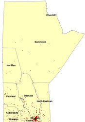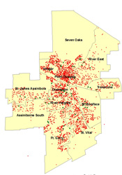 Geomapping based on postal code data highlighted regional differences in the participation of children and dental offices. Although Winnipeg appeared to be a hub where many children obtain this service, the provincial map suggests that many children residing throughout the southern half of Manitoba have had an FFV (Fig. 3). Tracking form data suggest that children do not necessarily receive their FFV in the RHA in which they reside; many obtain this service elsewhere. However, it appears that various dental clinics interspersed in rural RHAs are also participating in the program. The map of Winnipeg (Fig. 4) reveals that even children in some of the highest needs community areas (such as Downtown, Point Douglas and Inkster) have received FFVs.