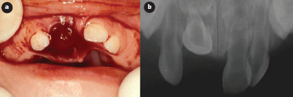 L'examen intrabuccal a révélé la présence d'un caillot de sang dans la région alvéolaire de l'incisive centrale supérieure droite primaire (dent 51), ainsi qu'une importante lacération de la muqueuse palatine (ill. 1a). À la palpation, une surface durcie a été perçue dans la région linguale. L'examen radiographique (ill. 1b) a révélé une intrusion marquée de la dent 51 avec luxation linguale.
