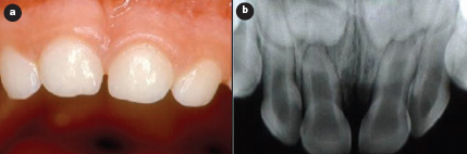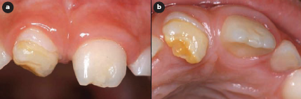 Ill. 4 : Malformation coronaire des dents permanentes : a) vue intrabuccale montrant une hypoplasie de l'émail sur l'incisive centrale supérieure droite permanente et une hypoplasie circulaire de l'émail sur l'incisive centrale gauche permanente; b) vue intrabuccale montrant la dilacération de la couronne de la dent 11 et la décoloration.
