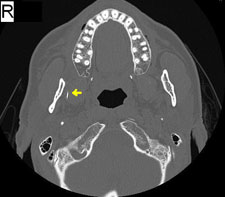 Ill. 2 : Tomodensitométrie (coupe axiale) montrant une partie de l'aiguille dans l'espace ptérygomandibulaire droit (flèche jaune).