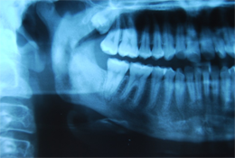 Ill. 1: Radiographie panoramique du processus ostéomyélitique associé au corps, à la branche montante et au condyle du maxillaire inférieur droit.