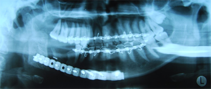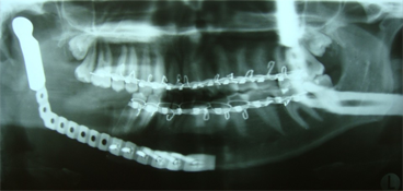 Ill. 6 : Radiographie panoramique du maxillaire inférieur reconstruit avec une grille mandibulaire prélevée d'un donneur décédé et un greffon spongieux particulaire autogène.